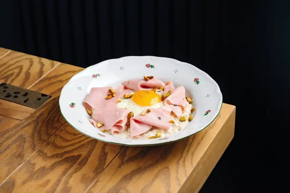 Овсяные хлопья варятся на воде с добавлением плавленого сыра. Украшается каша мортаделлой, глазуньей и фисташкой.