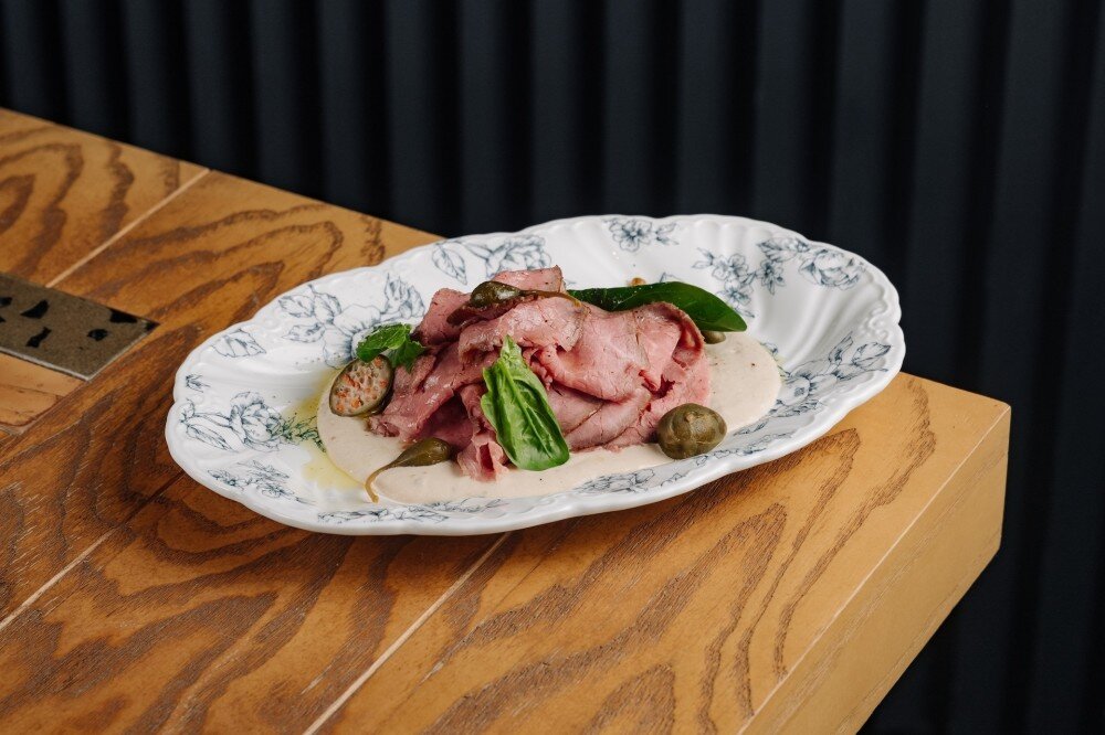 Сочные ломтики говядины подаются с соусом тоннато, украшенные шпинатом.Тонкие слайсы говядины medium, соус тоннато (тунец, каперсы, анчоусы, сливки, оливковое масло), каперсы, шпинат