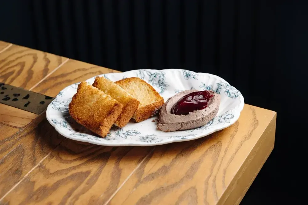 Печень куриная, лук, масло сливочное, яйцо, портвейн, вино красное, соль, вишня, сахар, бриошь.