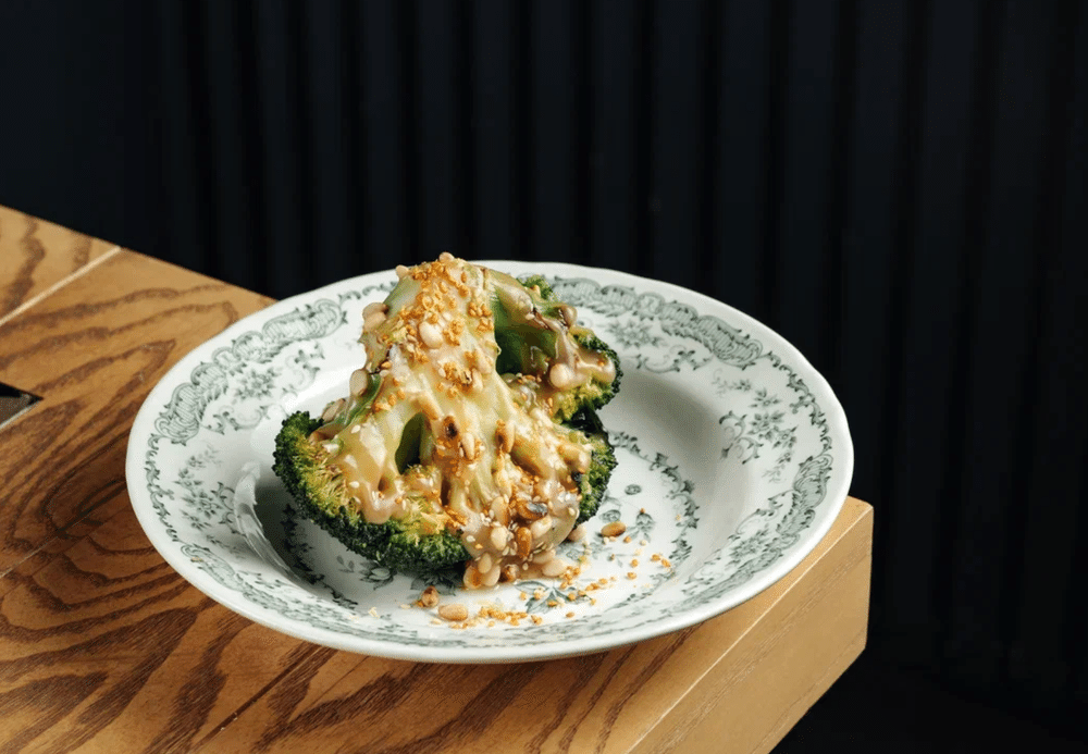 Свежая большая целая брокколи, обжаривается в хоспере, подается с горчично-кунжутным соусом и кедровыми орехами
