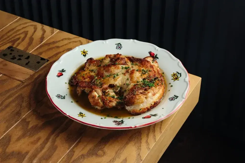 Фермерский цыпленок с трюфельным соусом» состав: цыпленок маринуется со сметаной, майонезом, паста табаджан, красным луком и чесноком, петрушкой. Трюфельный соусос на основе мирина, рисового уксуса, соевого соуса,куриный бульон, масло сливочное, паста трюфельная, масло трюфельное