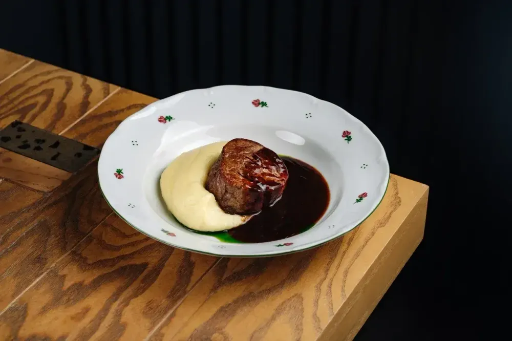 Стейк из говяжьей вырезки с картофельным пюре и трюфельным соусом