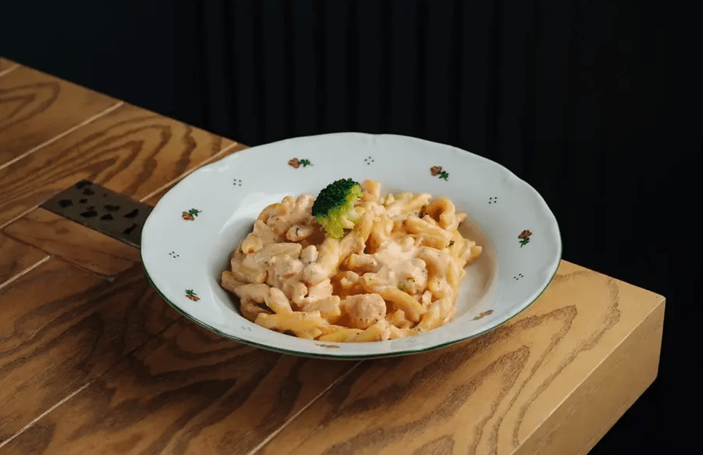 Домашняя паста маккерончини подается с лососем в томатном соусе наполи. Паста домашняя маккерончини, лосось, чеснок, петрушка, брокколи, томатный соус наполи, сливки