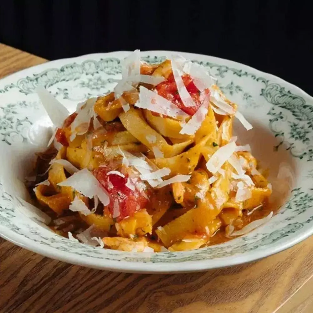 Паста тальятелле, лук-шалот, креветки, чеснок, соус биск (лук-порей, морковь, сельдерей, чеснок, панцири креветок, бренди, вода), сливочное масло, розовые томаты, рубленая петрушка, соль, перец, пармезан