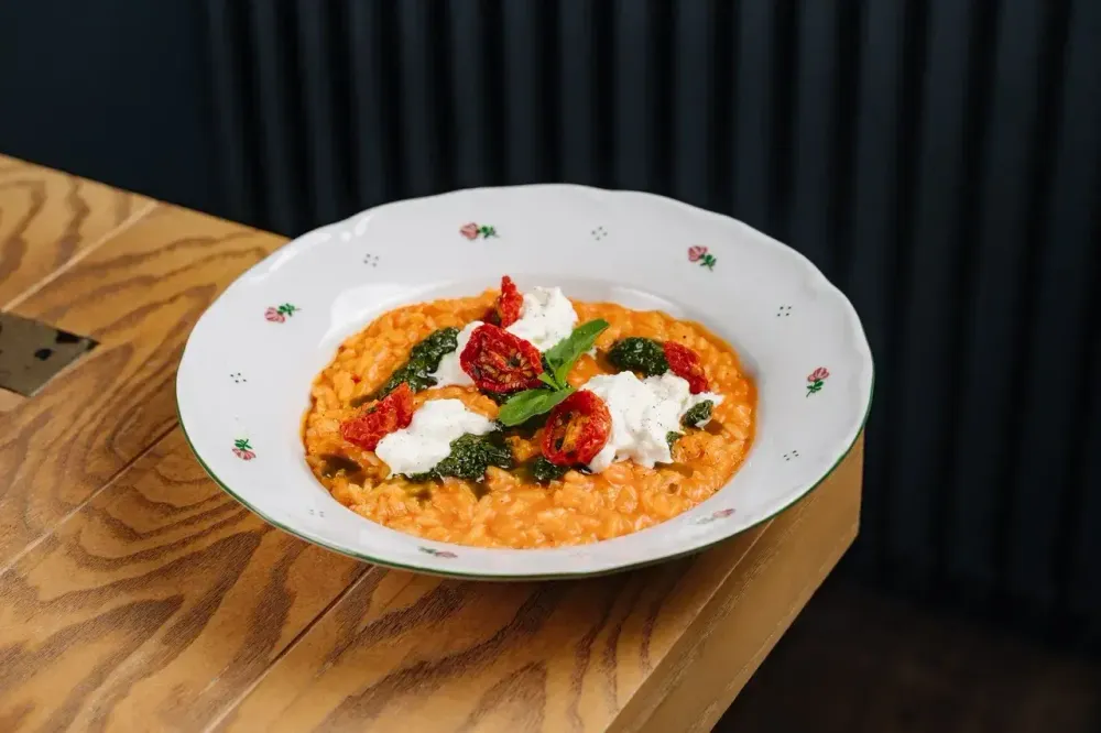 Ризотто с томатами, страчателлой и соусом песто