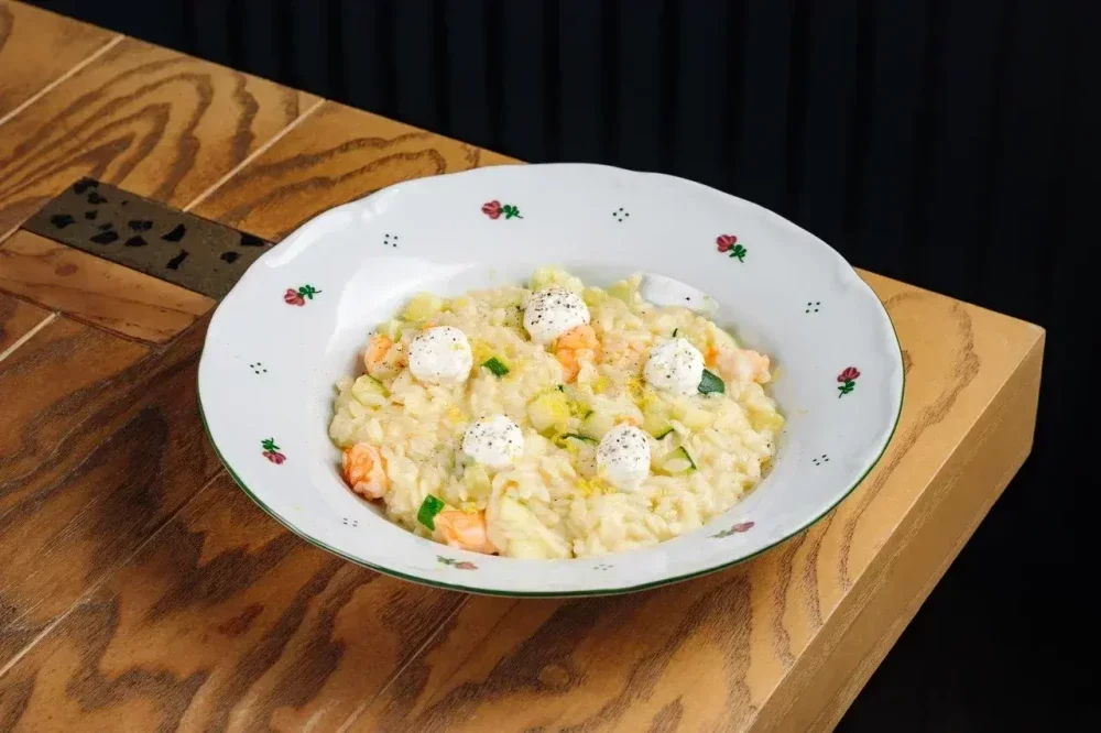 Паста орзо, сливочное масло, пармезан, цуккини, креветки, чеснок, соль, лимонная риккота (риккота, сливки, цедра лимона, масло оливковое).