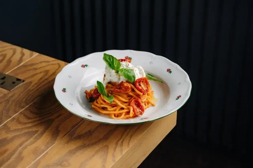 Спагетти, приправленные соусом наполи, подаются с вялеными томатами черри и страчателлой. Спагетти, соус наполи, сливочное масло, пармезан, вяленые томаты черри, соус песто, сыр страчателла, базилик.