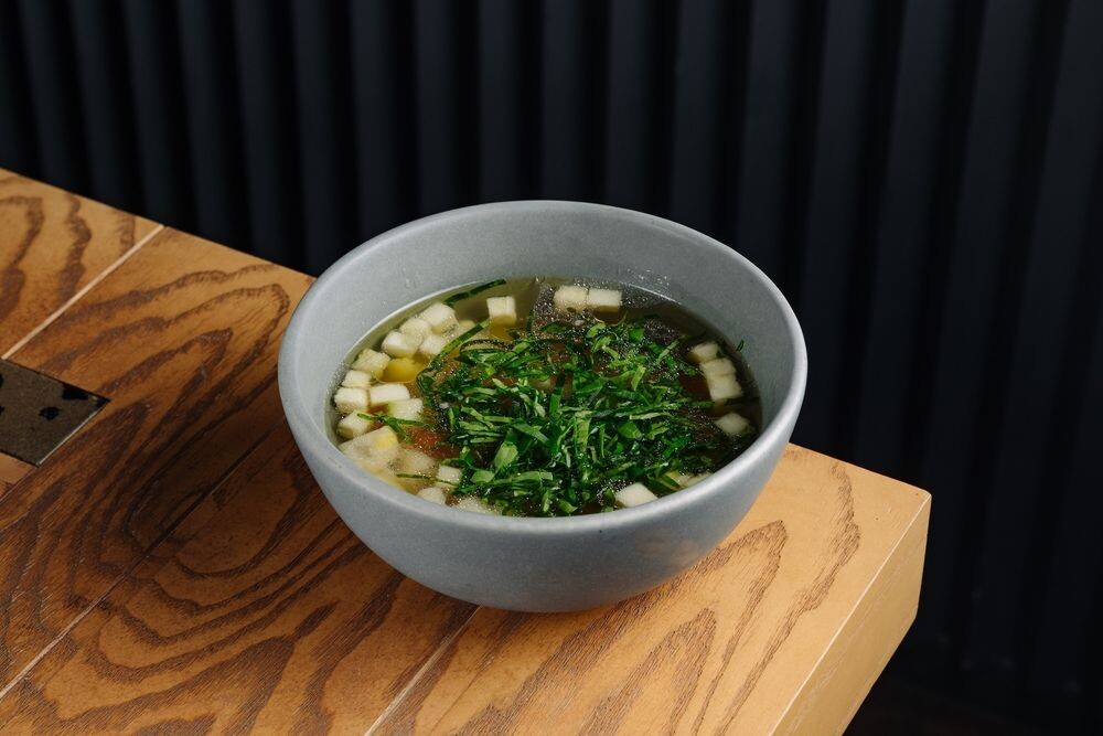 Насыщенный бульон с куриным филе, дополненный пастой орзо и овощами. Куриный бульон, куриное филе, паста орзо, шпинат, кабачок, морковь, цветная капуста