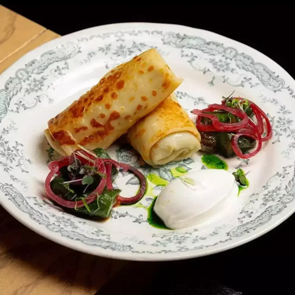 Блины с говядиной, трюфелем и битым огурцом