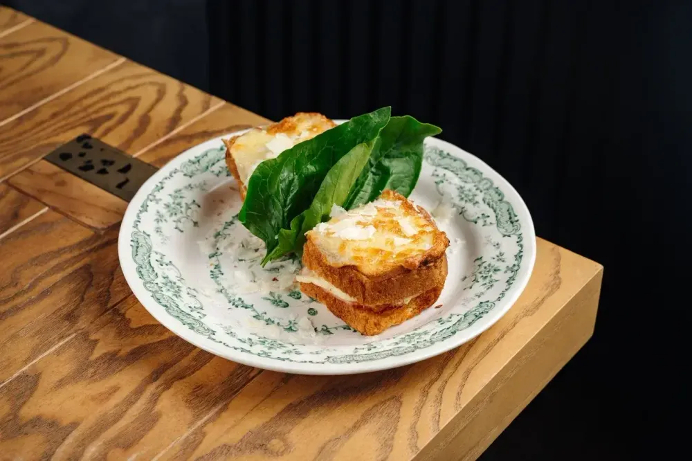 Хлеб бриошь, томаты, соус тоннато (тунец, анчоусы, каперсы, сливки, оливковое масло), моцарелла, ветчина, слайсы пармезана, шпинат