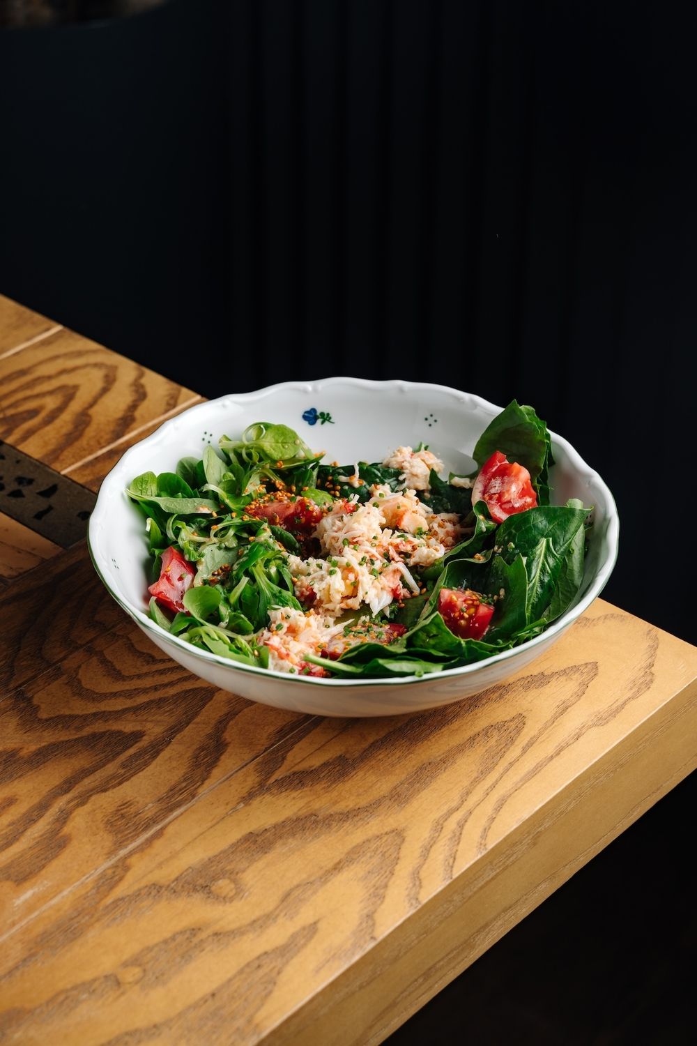 Томаты свежие, шпинат мини, салат маше, авокадо хасс очищенный, краб роза, салат фриссе, соус кунжутный дрессинг, масло сливочное чесночное, кунжут кимчи,масло оливковое чесночное, лук сибулет.