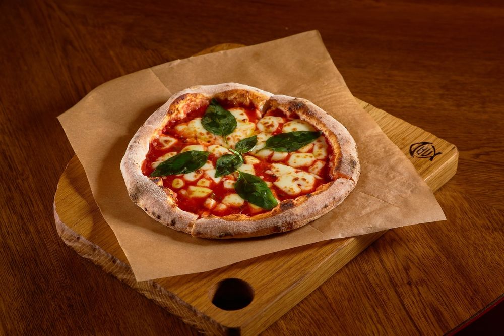 Тесто, томатный соус (томаты, базилик, соль, орегано), сыр моцарелла, базилик, оливковое масло