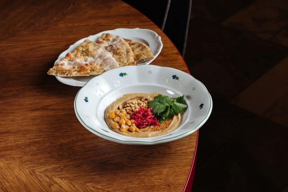 Хумус (нут отваренный с луком, морковью и сельдереем, паста тахини из кунжута, лимонный сок, соль перец, специи, печеный чеснок, масло оливковое, масло кунжутное), кедровый орех, маринованный лук, кинза, обжаренный нут, фокачча с розмарином