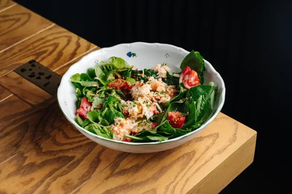 Шпинат, маше, авокадо, кунжут, краб, томаты черри, чесночное масло, цитрусовый понзу с кунжутным маслом