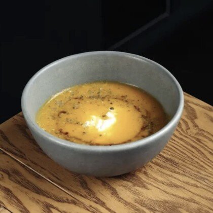 Тыквенный крем-суп (тыква, мед, лук, морковь, тимьян), тыквенные семечки, креветки обжаренные, бальзамический уксус