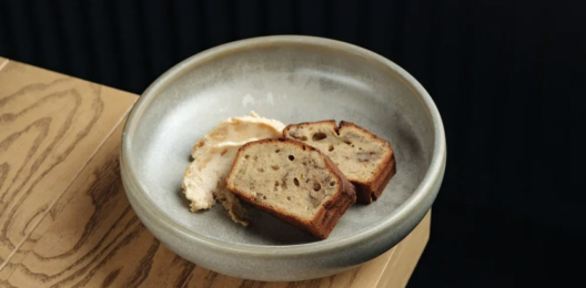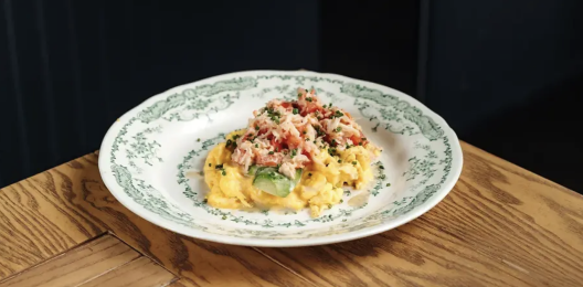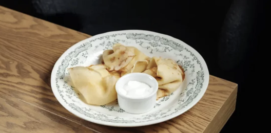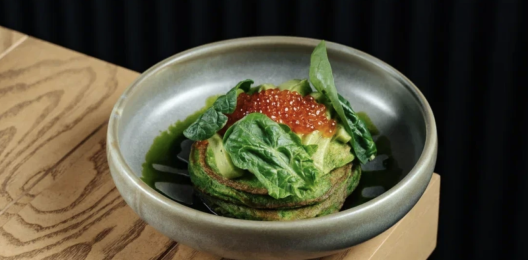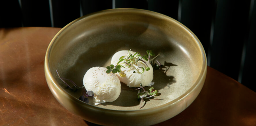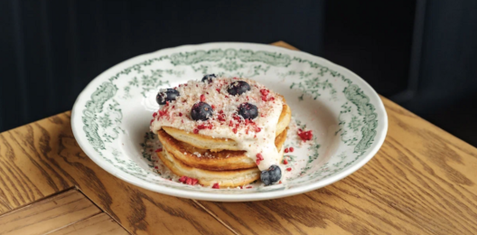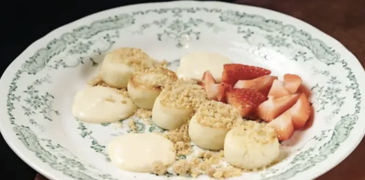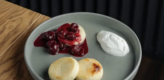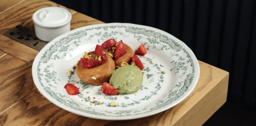 Сырники из топленого творога с фисташковым муссом и клубникой