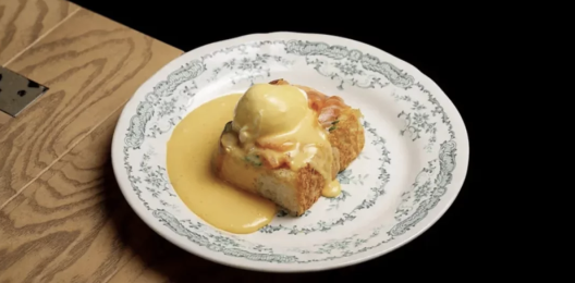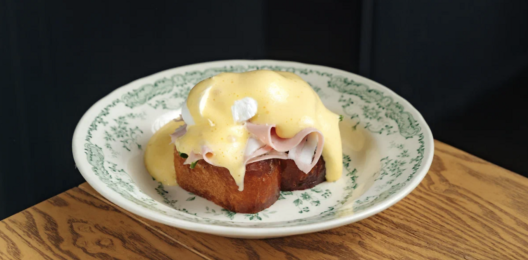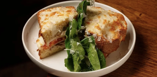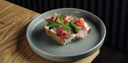 Бриошь с ветчиной, моцареллой, томатами и соусом вителло тоннато