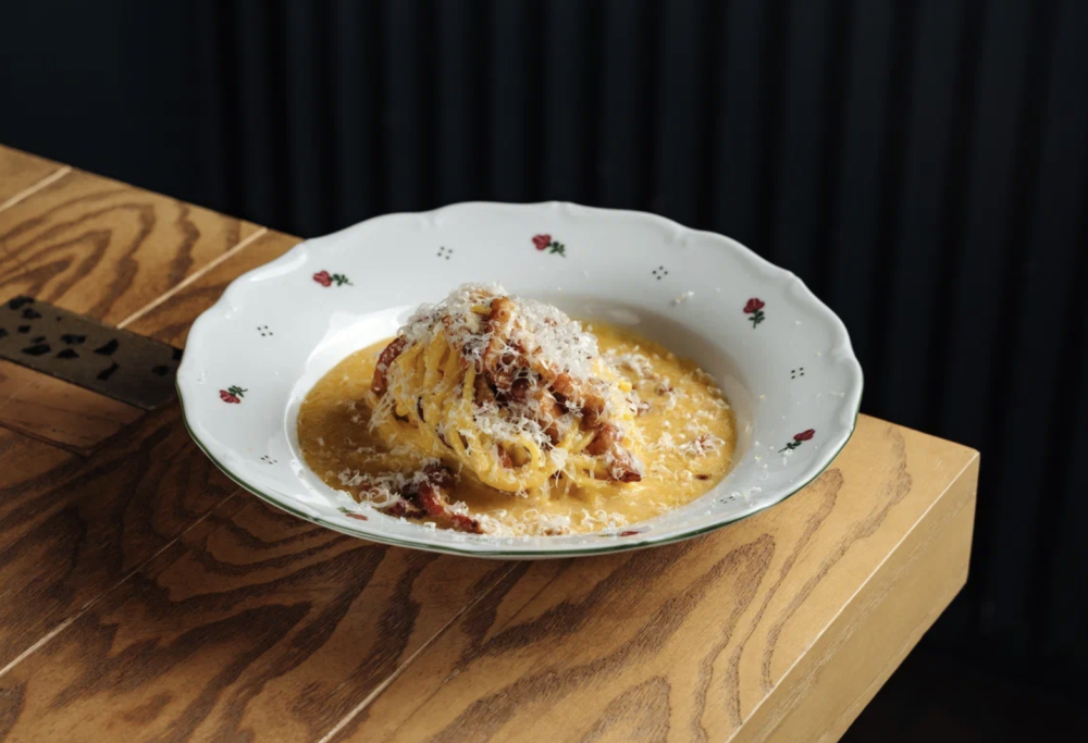 Паста спагетти заправляется смесью яиц и сыров и дополняется панчеттой. Паста спагетти, яйца, сыр пекорино и пармезан, черный перец, панчетта